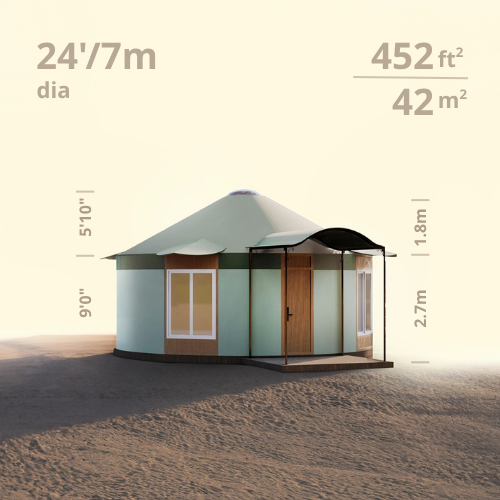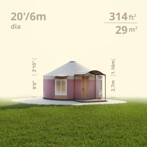 3 sizes — 20'(6m), 24'(7m) and 32'(10m) in diameter. 1300 color combinations. 6 window styles. Infinite interior layouts. Unique accessories like automated domes & blinds for domes make your yurt like none other.